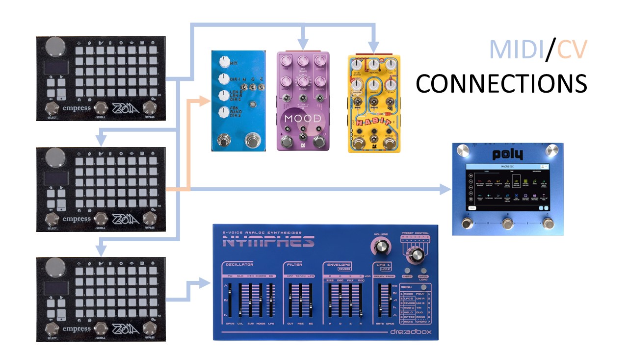 Zoia 1 functions as the master clock and sends control messages to many of the other pedals coordinating events. Zoia 2 receives messages from Zoia 1 and relays messages to Beebo. Zoia 2 also controls some of the functions of Count to Five via CV. Zoia 3 receives messages from Zoia 1 and relays messages to the Dreadbox Nymphes.